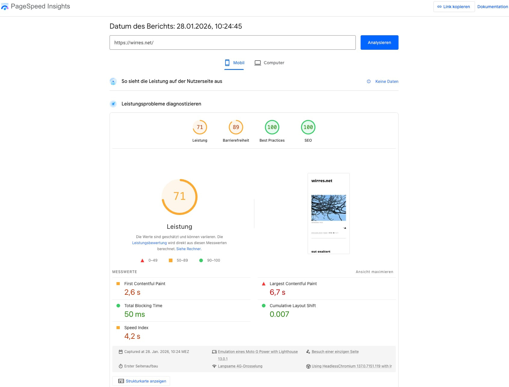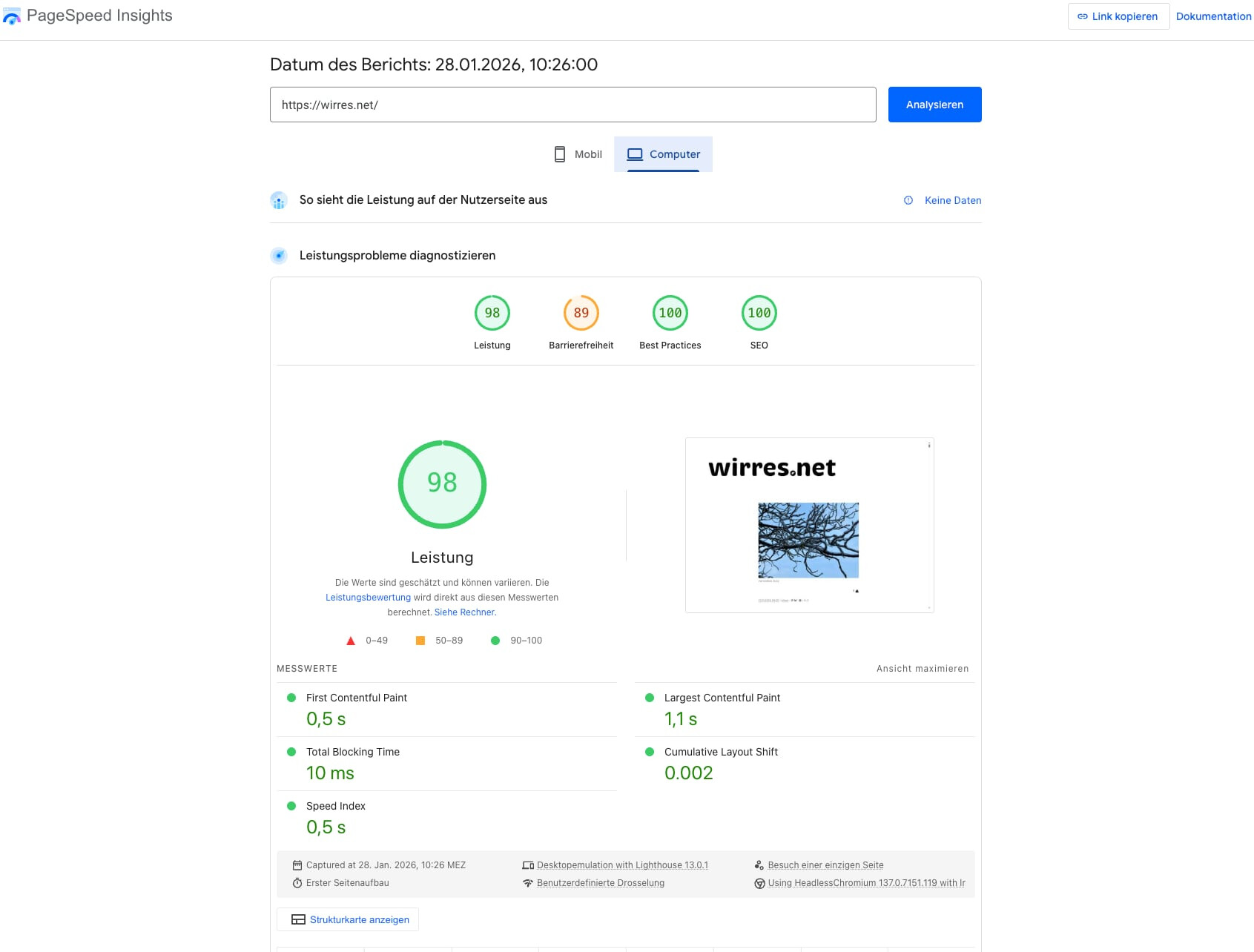vor ein paar monaten habe ich sehr viel energie darein gesteckt in den PageSpeed Insights gute punktzahlen zu bekommen. dabei habe ich viele anpassungen am server vorgenommen, die html-struktur, lazy und eager-loading und die bildgrössen optimiert. mit der startseite ist google nicht immer 100% zufrieden, aber die einzelseiten schrammen in der regel an den 100%.