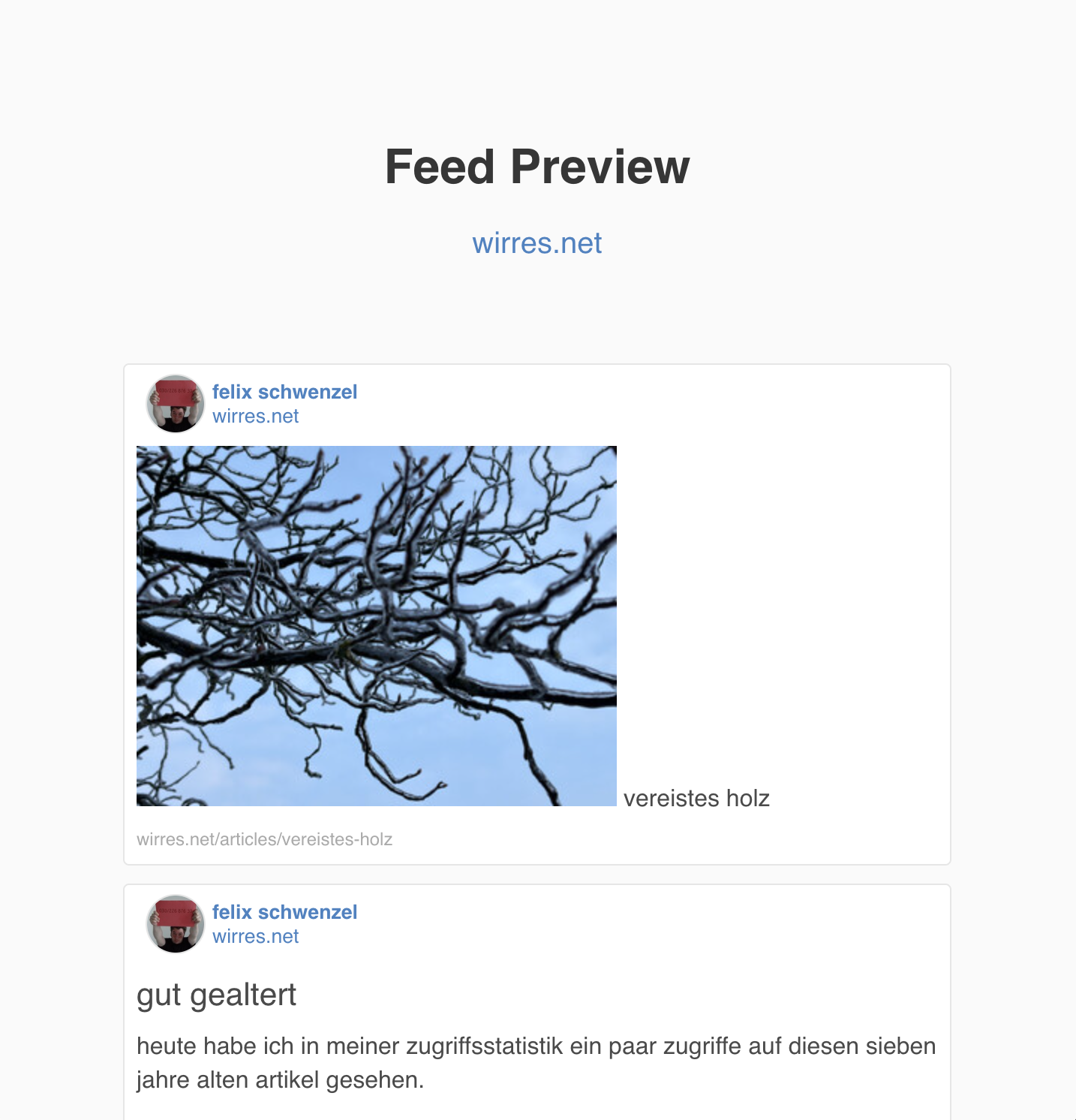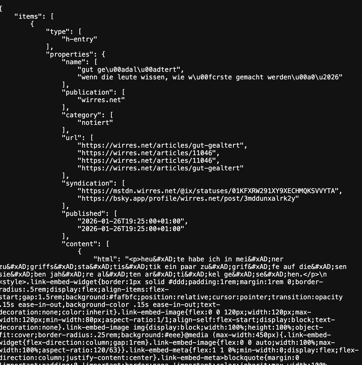 weil ich selbst gerne und viele webseiten per RSS lese, prüfe ich auch regelmässig wie meine seite in RSS aussieht — und wenn mir was auffällt oder mich stört, optimiere ich es weg. neben diversen RSS-feeds, biete ich diese webseite auch sozusagen als html-feed an. das geht, weil ich das HTML mit microformaten (mf2) auszeichne. damit lässt sich diese seite als json parsen (beispiel) und sogar als html-feed abonnieren (vorschau)