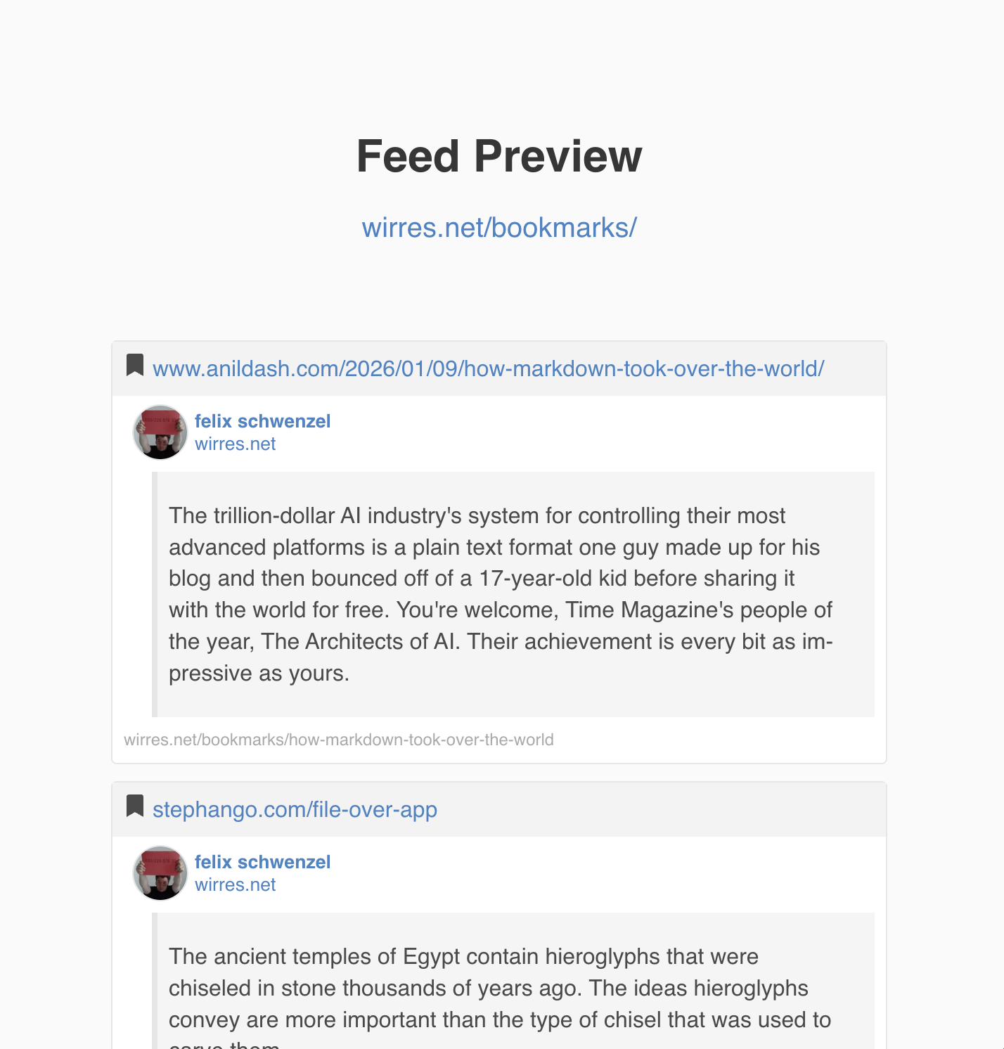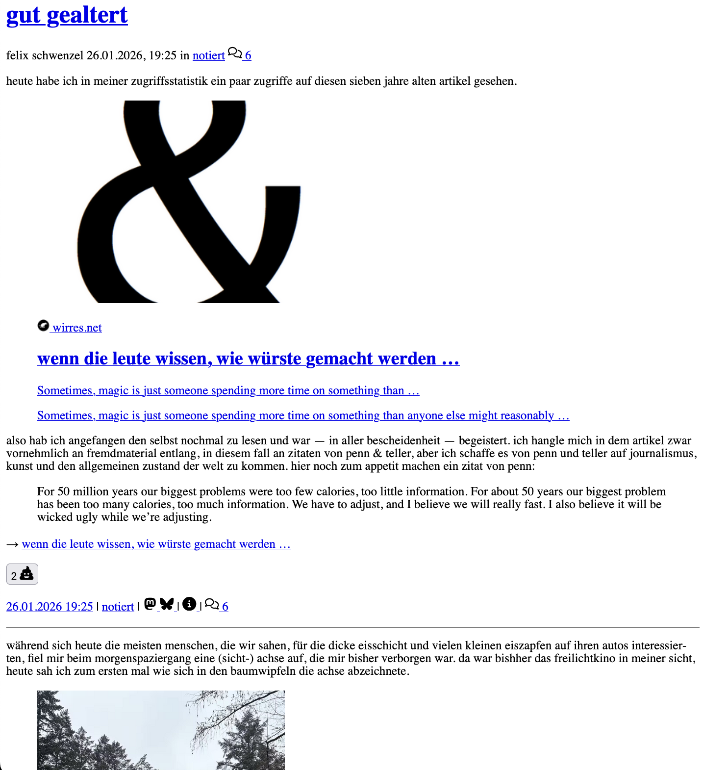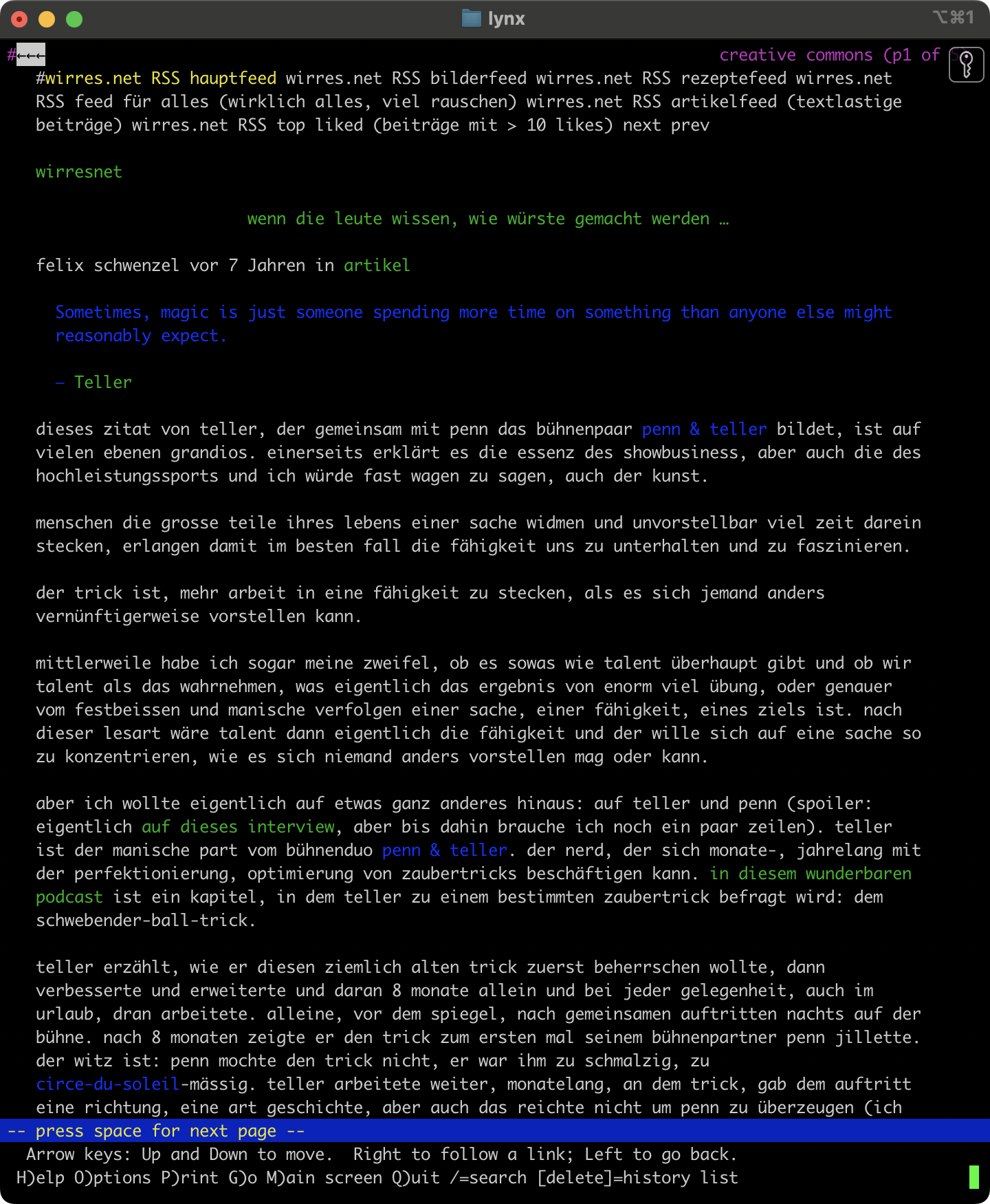 all diese ansichten, in lynx, ohne css, als geparste oder gerenderte mf2-microformate oder als RSS-feed, sind ansichten dieser website, wie sie auch maschinen sehen, suchmaschinen- oder KI-crawler, der rivva-bot oder andere aggregatoren. auch screenreader sehen die website eher in diesen minimalversionen, weshalb ich auch ein interesse daran habe, dass wirres.net in diesen ansichten ganz okay aussieht, bzw. mir gefällt.