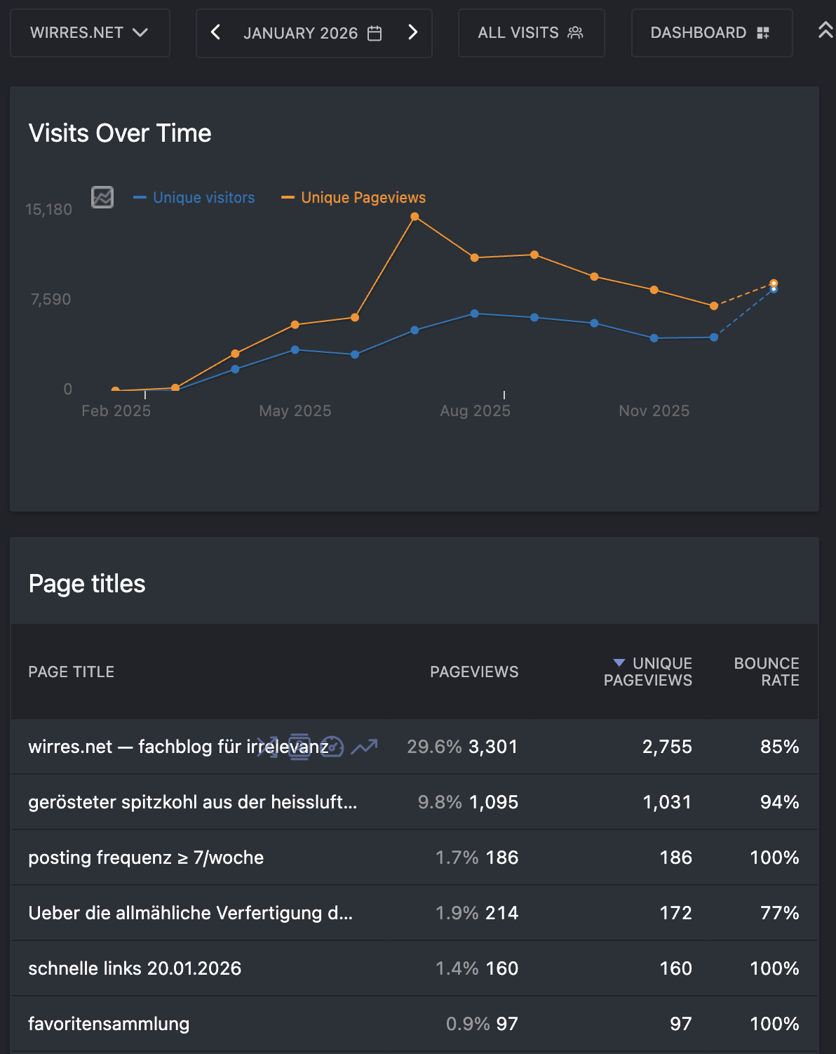 ich bemühe mich natürlich auch um gute maschinenlesbarkeit damit sich meine webseite gut mit google versteht. nach meiner blogpause und ein paar monaten offline-zeit wegen technischer probleme, verlor ich alle sympathien die mir google vormals gewährt hatte. noch nicht mal eine suche nach meinem namen zeigte meine heimstätte im netz (wirres.net) mehr auf den ersten 10 suchergebnisseiten an. nachdem ich es hier wieder schön für google und andere maschinen gemacht habe, schickt mir google auch gelegentlich wieder besucher vorbei. derzeit zwar nur für eine seite (erfreulich und erschütternd), aber dafür im januar so um die 1000.