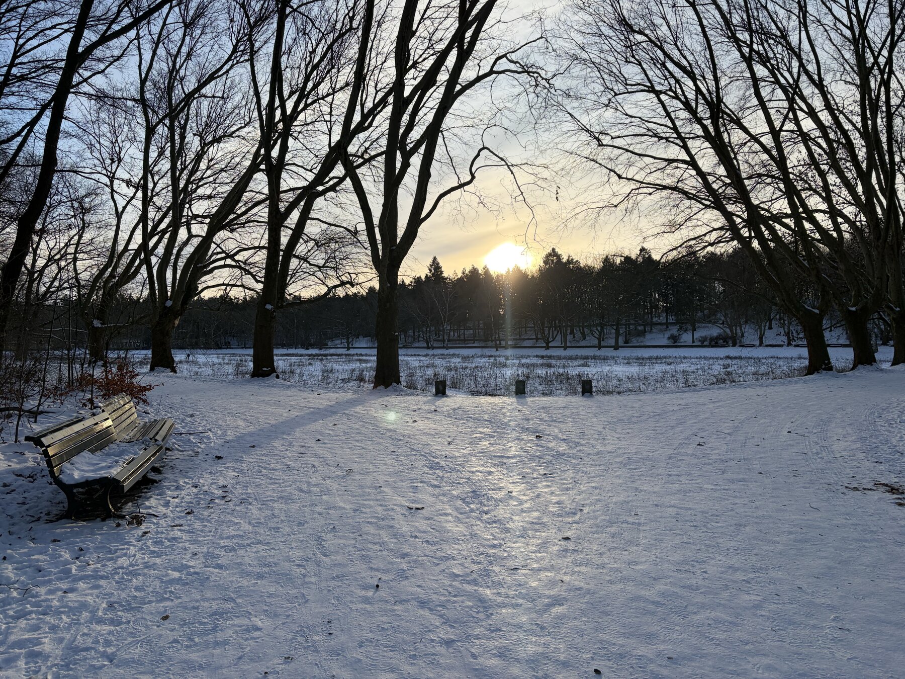 alt-text: sonnenaufgang über der catcherwiese in den rehbergen. im vordergrund glänzt der zu eis festgestampfte schnee in der morgensonne, im hintergrund kahle böume