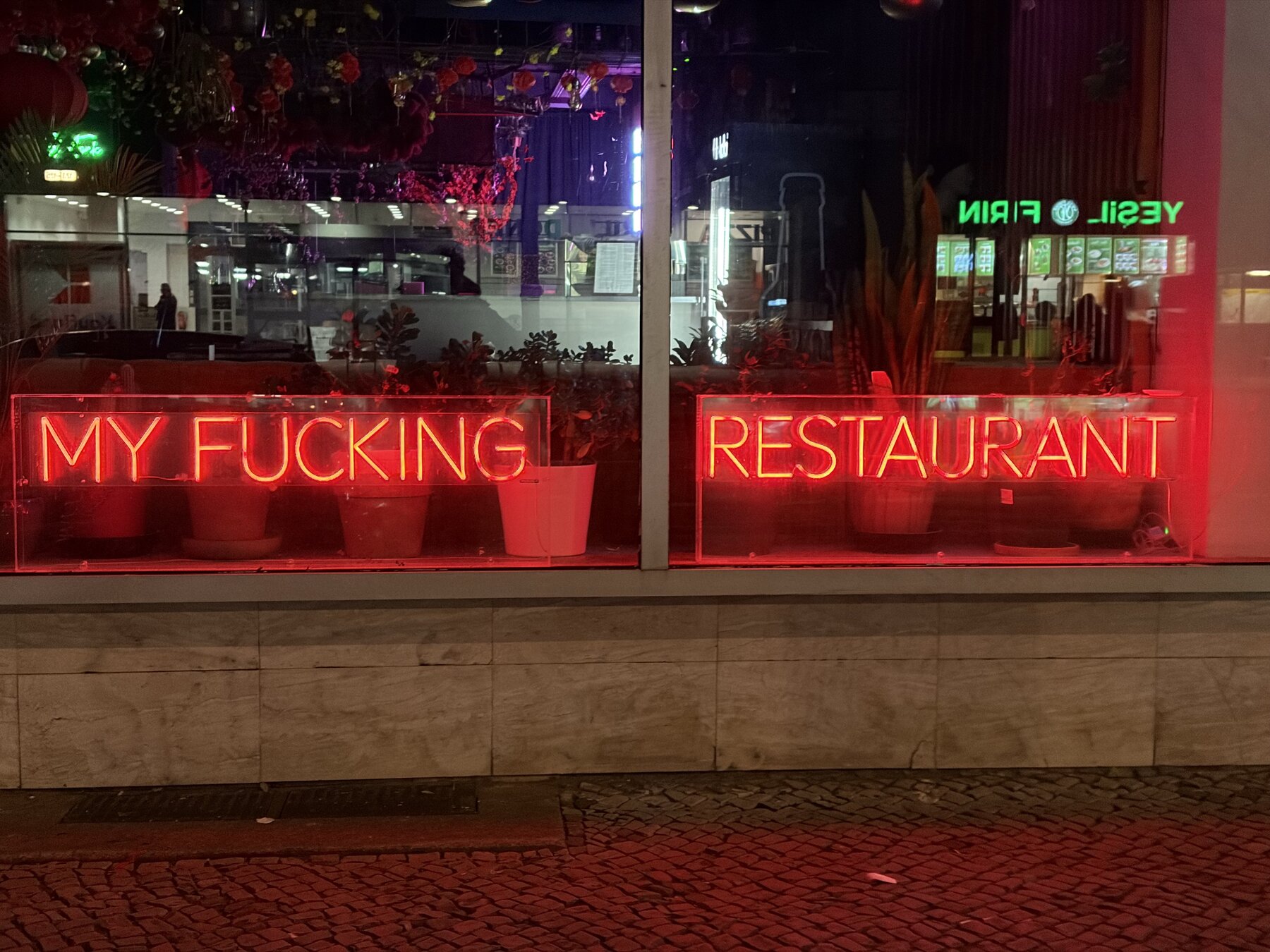 alt-text: foto des eines restaurant schaufensters mit der neonschrift „MY FUCKING RESTAURANT“ an der müllerstrasse gegenüber kaufland (man sieht die reflektion von kaufland im schaufenster)