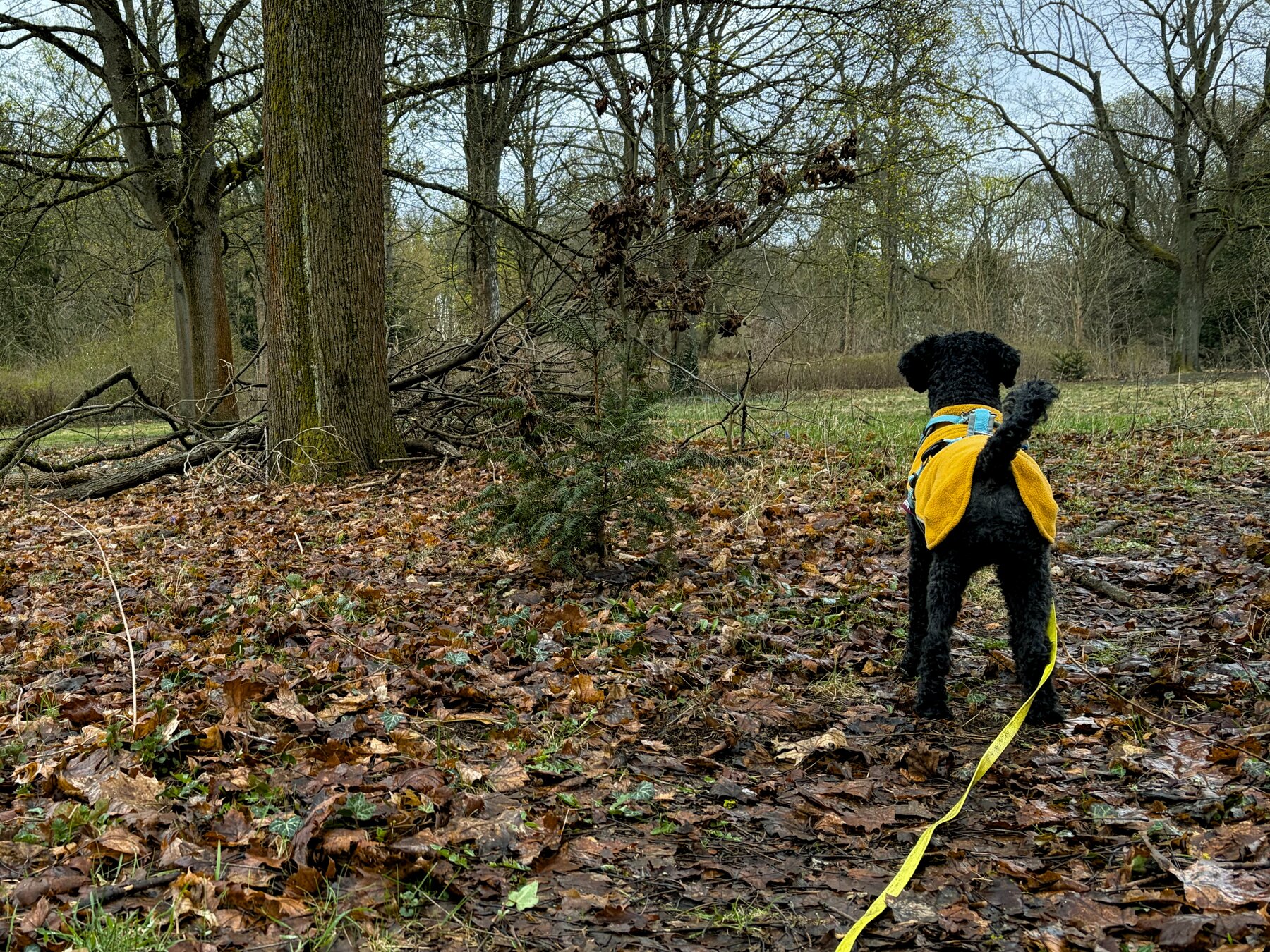 alt-text: ein kleiner nadelbaum, der ein bisschen wie ein weihnachtsbaum aussieht, neben einem kleinen hund (frida) im gelben jäckchen.