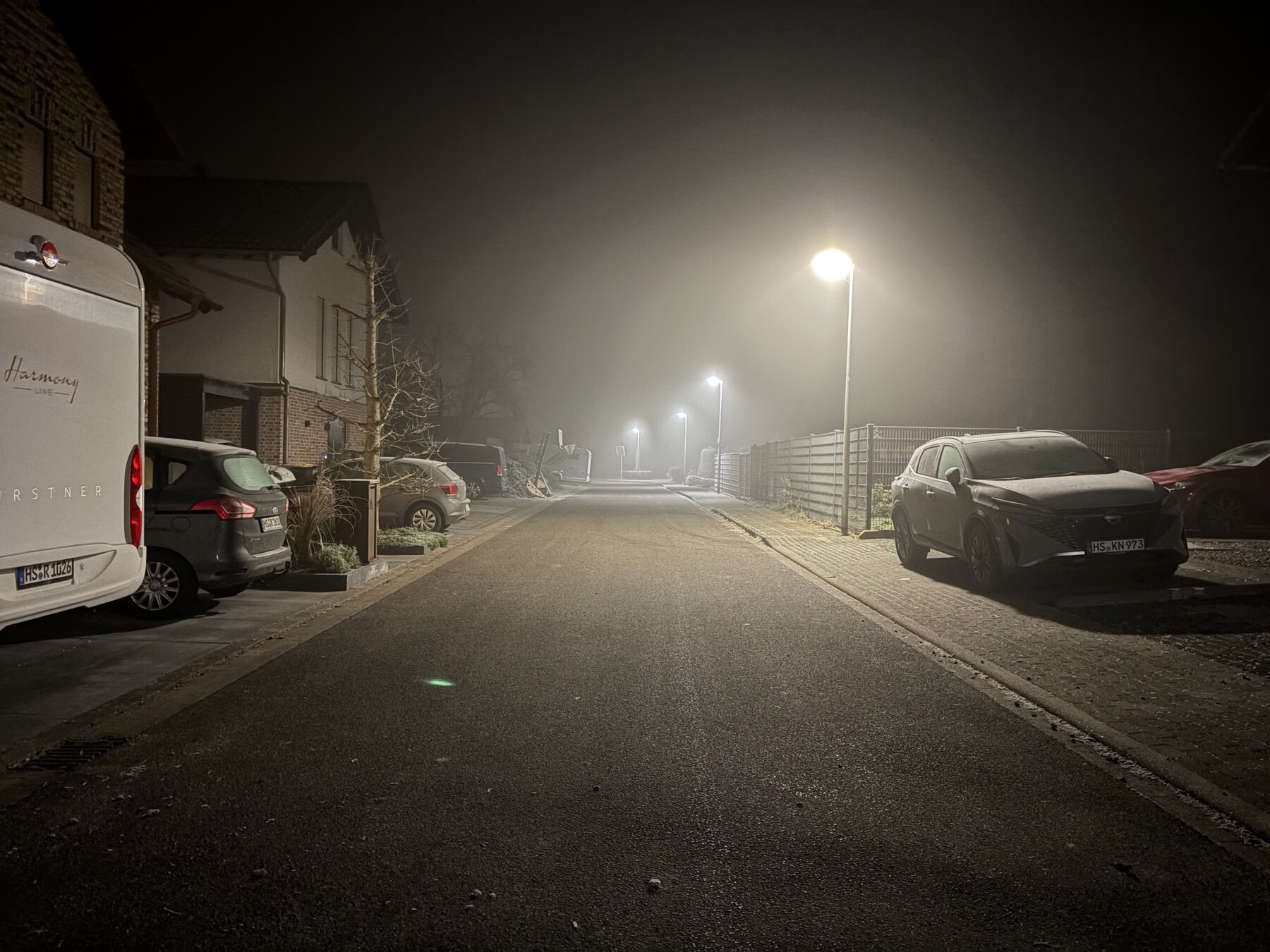alt-text: nachtbild des johann frenken wegs in karken, es ist neblig und es liegt raureif, die strassenlaternen beleuchten den nebel.