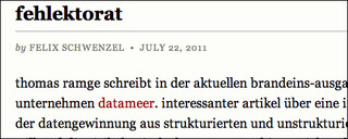 thomas ramge schreibt in der aktuellen brandeins-ausgabe über das hallenser unternehmen datameer. interessanter artikel über eine interessante firma, die mit der datengewinnung aus strukturierten und unstrukturierten daten geld verdienen will und die risikokapitalgeber von KPCB hinter sich stehen hat und so theoretisch zum nächsten google, amazon oder facebook werden könnte.