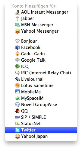 [theoretisch kann adium übrigens auch twitter und skype, aber durch twitter und den ständigen strom an tweets fliessen mir dann doch ein bisschen viele informationen zu und skype ist leider noch nicht 100prozentig in adium integriert und benötigt noch skype selbst als hintergrundprozess. aber vielleicht ändert sich das durch die neue strategie bei skype ja auch bald.]
