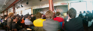 ich habe dann auch irgendwann, so gegen die mittagszeit angefangen zu reden. auf der treppe, an der theke, im hof, beim falaffelmann. meistens versucht man in den gesprächen abgebrochene email-konversationen weiterzuführen („tut mir leid, dass das mit den tickets nicht geklappt hat“), aufgeschnappten tratsch zu verifizieren („bist du jetzt echt wieder single?“) oder mit in blogs angelesenem wissen zu glänzen („ist das dein hochzeitsanzug?“). auch wenn ix gestern ein paar neue gesichter kennenlernen durfte („ich bin der den du vor nem jahr mal gedisst hast“, „ich les dich“), sind die gespräche und gesprächspartner zum grossen teil exakt die gleichen wie vor einem jahr. hört sich doof an, ist aber ziemlich angenehm. weniger angenehm dürften die interviews sein, zu denen die veranstalter von diesen berichterstattern gezwungen werden. irgendwann gestern platzte es aus aus markus beckedahl raus. in einer interview-pause, meinte er, dass er ein bisschen müde sei, immer wieder blogs für über 60jährige zu erklären.