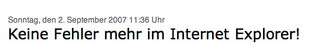 keine fehler mehr im ie? das würde mich wirklich wundern, wo internet-explorer doch so eine art synonym für „fehler“ geworden ist und ein fehlerloser ie ähnlich schwer vorstellbar ist wie ix ohne rechtschreibfehler. und natürlich meinen die natürlich nicht den explorer, sondern ihre eigene webseite.