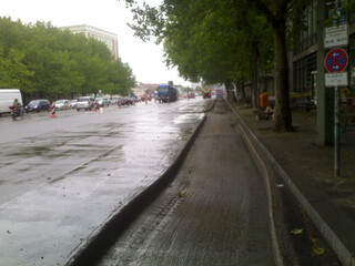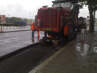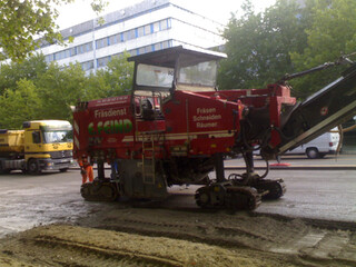 die maschine hatte so gegen 9 bereits eine ziemlich grosse furche in die breite strasse in mitte gefräst. einfach so. sie fährt über die strasse und frisst sie quasi auf.