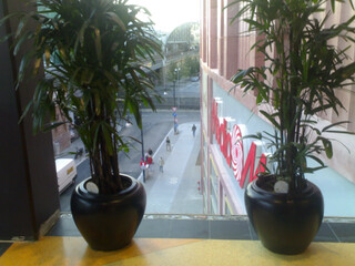 ich kann auch positives berichten: der rosa beton fühlt sich gut an, die haptik ist enorm angenehm. trotzdem, ich habe selten so schlecht zusammengefügten beton gesehen. kaum ein detail sitzt, alles wirkt wie von ästhetischen laien zusammengefügt. selbst die gar nicht so dumme geste die betonplatten aussen, auf der s-bahn zugewandten seite wie vorhänge wirken zu lassen wird durch absurde, riesenhafte löcher für die werbeplakat-beleuchtung und die plakate selbst konterkariert. die ecken des gebäudes, innen wie aussen, fügen sich nicht, alles was es an architektonischen gesten noch zu erkennen gibt wird mit grünzeug, plakaten und überkandidelter deko hilflos verdeckt. der bau ist ein elend und macht mir angst. ich werde vermutlich nie wieder einen fuss hinein setzen.