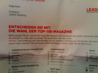 bei den lead-award-einladungskarten war ein zweiseitiger fragebogen dabei: „ENTSCHEIDEN SIE MIT: DIE WAHL DER TOP-100-MAGAZINE“.