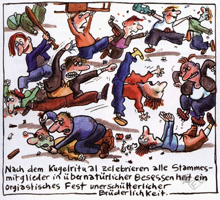 [nach dem kugelritual zelebrieren alle stammesmitglieder in übernatürlicher besessenheit ein orgiastisches fest unerschütterlicher brüderlichkeit.]