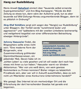 fiete stegers versucht sein ramponiertes image zu flicken und achtet bei seinem heutigen bericht auf tagesschau.de über „moni-gate“ diesmal darauf beide seiten der medaille zu beleuchten. nur wenn er behauptet, dass „ein Teil der Community“ auch bereits gedanken darüber mache „ob nicht bei den harschen Reaktionen der Blogger über das Ziel hinausgeschossen wurde“ bleibt ist das sowohl unbelegter (und an den haaren hergezogener) schwachsinn, als sich auch sein „kronzeuge“ darüber wundert, was ihm da an zitaten aus dem zusammenhang gerissen wurde und* dass ihn niemand mit professionellen journalistischen ansprüchen angerufen oder gefragt habe. ich halte es mit dr. dean: „die blogger“ kann man im zusammenhang mit „moni-gate“ gar nicht genug loben. undifferenziert waren da auch nach jörg-olafs meinung eher andere.