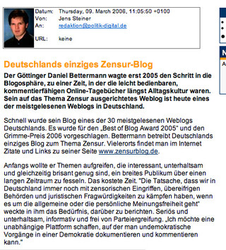 heute hat sich daniel bettermann, betreiber des zensurblogs bei mir gemeldet. es ging um meine meckerarie über jens steiners text über das zensurblog auf politik digital. er legte mir ausführlich dar, dass die von mir kritisierten aussagen die jens steiner ihm in den mund legte so nicht gemacht wurden. jens steiner hat ein email-interview mit daniel bettermann geführt und da offenbar so einiges falsch verstanden und wie er jetzt sagt „ungenau gearbeitet“. das original interview kann man jetzt auch auf politik digital lesen und nachdem die redaktion ihn kurzzeitig vom netz genommen hatte, auch wieder den original text. der vollständigkeit halber, zitiere ich hier auch nochmal was mir daniel bettermann schrob, eine meinung kann man sich ja nun auch dank des original mail-interviews selbst schneidern:
