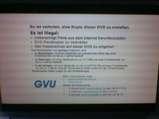 gestern habe ix wieder DVD gucken wollen, 2,50 hat mich das vergnügen gekostet, weil ich ihn legal aus der DVDhek geliehen habe. erst kam ein trailer, den man nicht überspringen konnte, in dem mir mitgeteilt wurde, das filme runterzuladen diebstahl sei. super gemacht. danach ein screen auf dem gross stand: „es ist verboten, eine kopie dieser DVD zu erstellen“