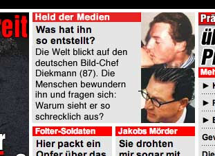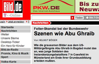 bild am sonntag (BAMS) behauptet, dass die bild-„zeitung“ den guten ruf der bundeswehr beschädigen will. diekmann hat das nicht bemerkt, der guckt sich die scheisse die seine redakteure schreiben offenbar nicht an, vielleicht weil er wie axel springer schmerzen beim lesen der bild-„zeitung“ verspürt. aber zum kontroll-lesen gibts ja zum glück das bildblog.