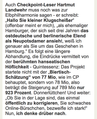 Auch Checkpoint-Leser Hartmut Landwehr muss noch was zur Elbphilharmonie sagen - er schreibt: „Hallo Sie kleiner Klugscheißer“ (offenbar meint er mich), „als ehemaliger Hamburger, der sich seit drei Jahren das ostdeutsche und berlinerische Elend als Neupotsdamer ansieht, weiß ich genauer als Sie um das Geschehen in Hamburg.“ Es folgt eine längere Abhandlung, die Eindrücke vermittelt von der berühmten hanseatischen Höflichkeit - Quintessenz: Das Projekt startete nicht mit der „Biertisch-Schätzung“ von 77 Mio, wie im CP behauptet, sondern von 78 Mio, also beträgt die Steigerung auf 789 Mio nur 923 Prozent. Donnerlüttchen! Und weiter: „Ob Sie in der Lage sind, das einmal öffentlich zu korrigieren, Sie schwaches Online-Bürschchen, bezweifle ich stark!“ Nun, ich denke drüber nach.