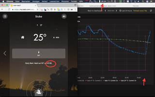 eingestellt sind 24° für heute früh um 7 uhr. jetzt ist es gleich 6 uhr und es herrschen bereits kuschelige 25° im wohnzimmer.