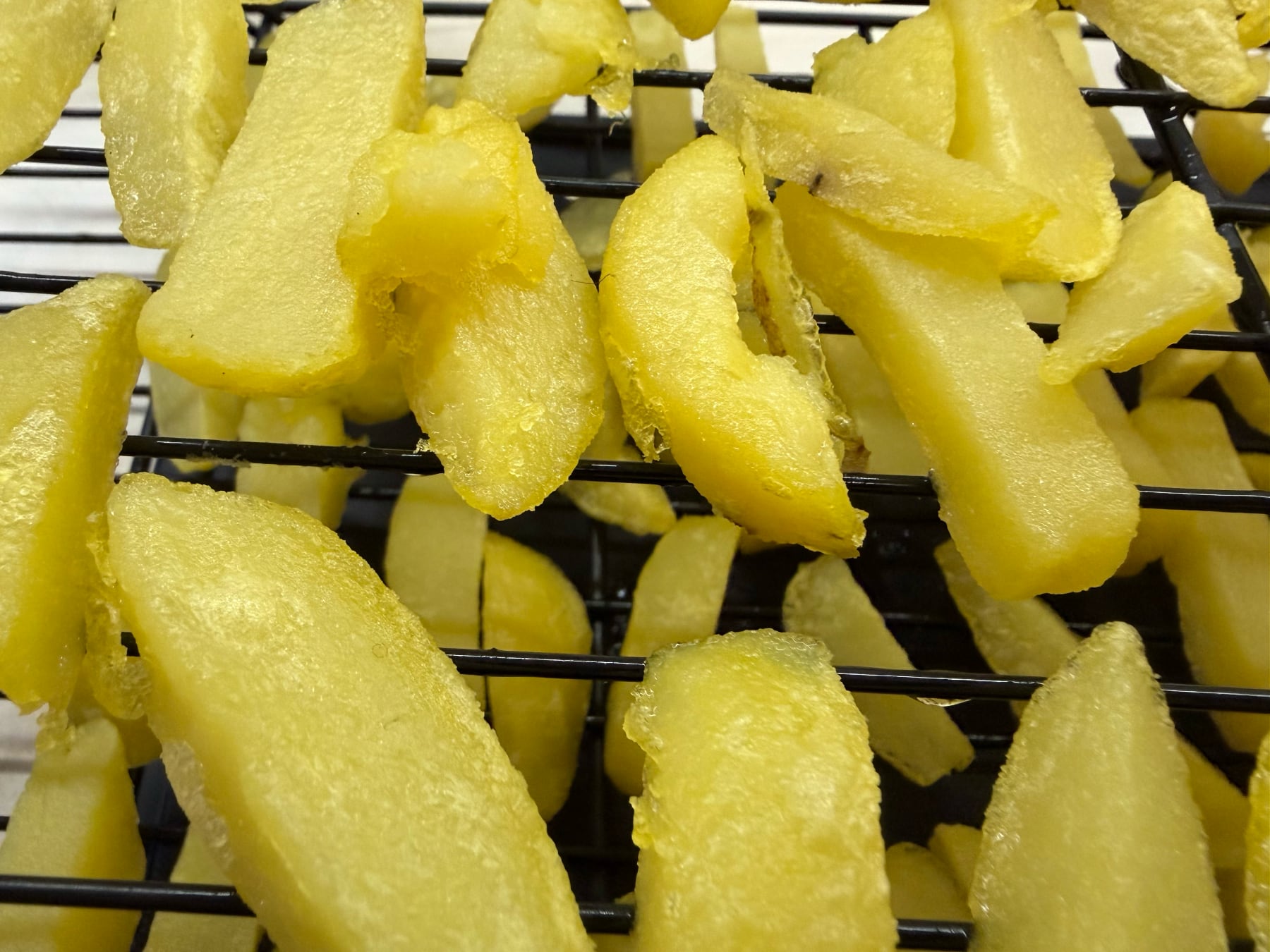 alt-text: nahaufnahme der pommes nach dem ersten fritieren, man sieht bereits gut die raue oberflächenstruktur