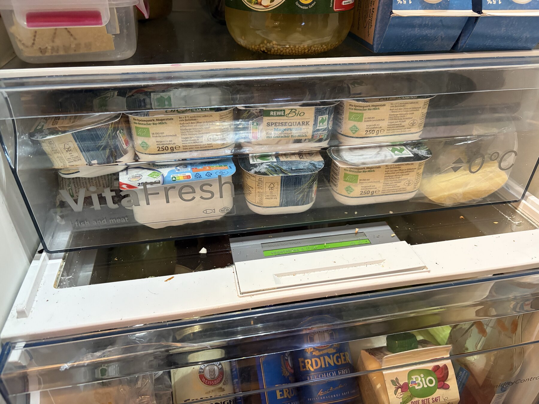 alt-text: foto in unseren kühlschrank, man sieht sehr viele 250 gramm packungen quark