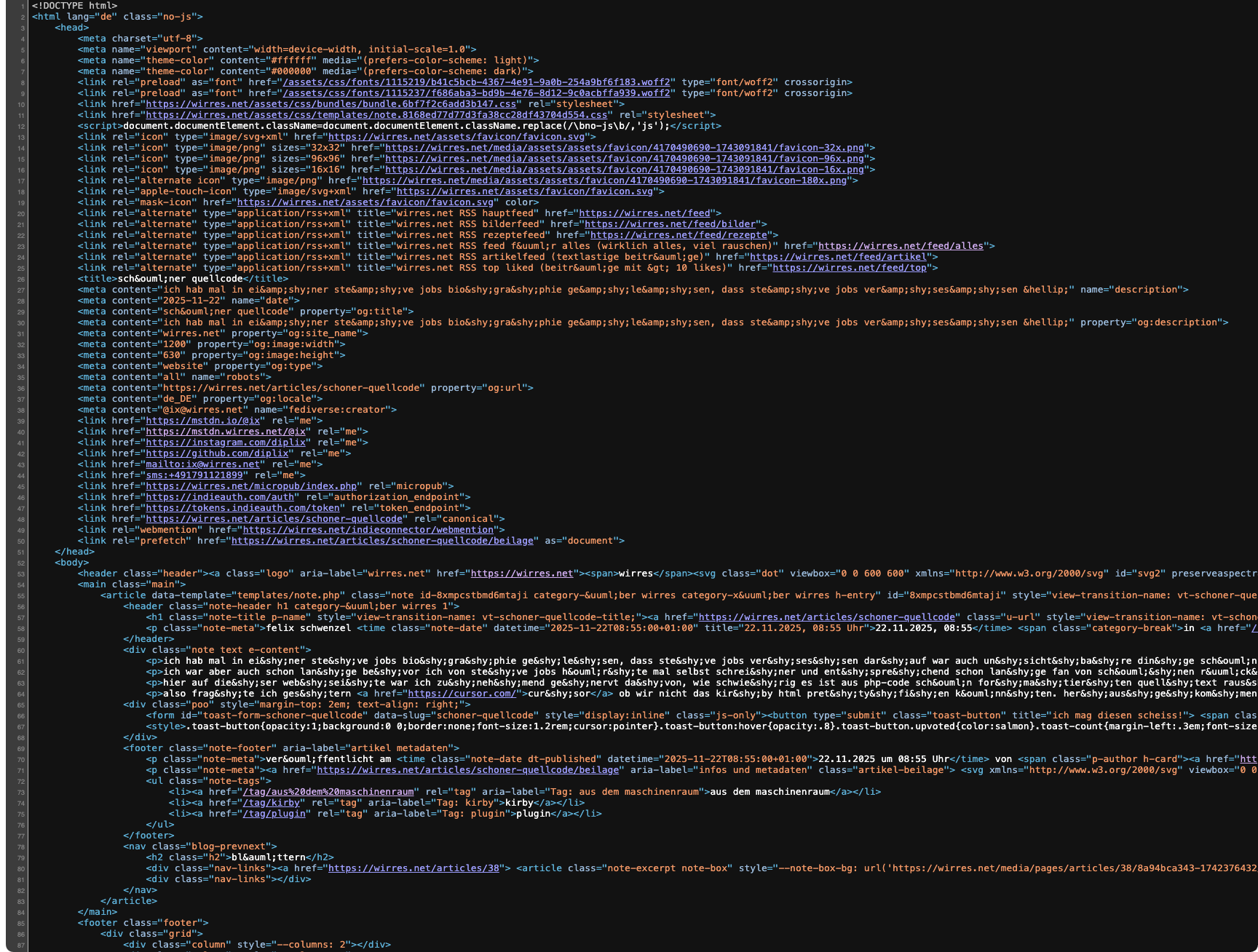 also fragte ich gestern cursor ob wir nicht das kirby html prettifyen könnten. herausgekommen ist ein plugin, der mit dem kirby page.render:after hook das gerenderte html durch html-pretty-min jagd. das ergebnis erfreut mich so sehr, dass ich es als kirby-plugin auf github veröffentlicht habe: github.com/diplix/kirby-html-pretty