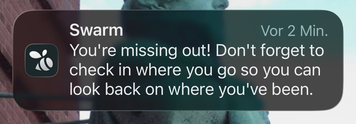 alt-text: screenshot einer notification von „swarm“ auf meinem telefon: „You’re missing out! Don’t forget to check in where you go so you can look back on where you’ve been.“