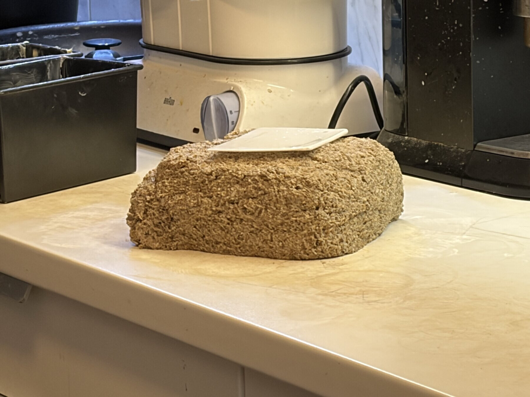ich rühre den gesäuerten roggenschrot und den weiteren schrot in unserer knetmaschine mit dem K-hacken, nicht mit dem knethaken. das soll laut lutz geißler 10 bnis 15 minuten lang passieren, bis „der Teig auf Druck nicht mehr mit Bruch reagiert, sondern sich plastisch verformen lässt“.