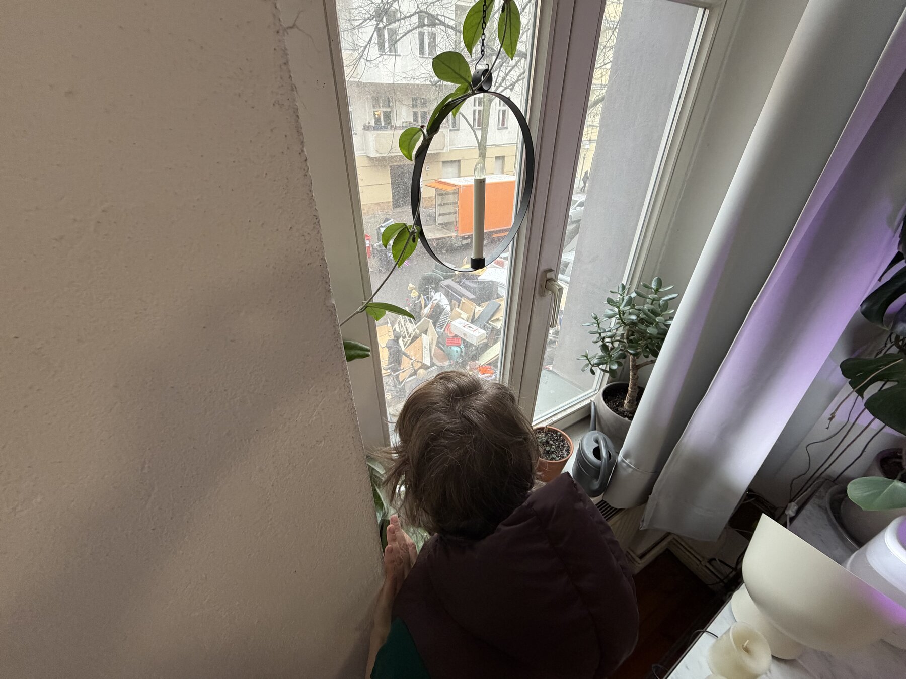 alt-text: die beifahrering schaut aus unserem strassenfenster auf den „kieztag“ vor unserer haustür. die strasse ist voll mit bsr-müllautos, sperrmüll und sperrmüllspechten