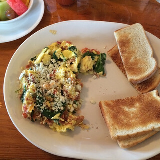 scrambled eggs with spinach, bacon and bleu cheese (bleu cheese sagen die hier wirklich).