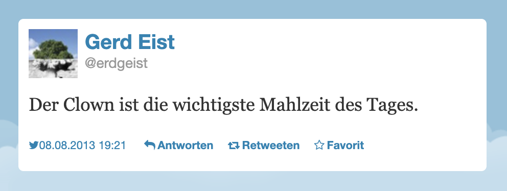 deshalb kann ich jetzt wieder alte twitter favoriten die ich vor 14 bis 10 jahren offensichtlich regelmässig und zahlreich gesammelt habe wieder ansehen: #twitterfavs. da sind erstaunlich gute sachen dabei, allerdings sind dann doch einige der bilder „gebrochen“. die favoriten ab april 2014 sehen übrigens nochmal etwas anders aus. vorher hab ich blackbirdpie genutzt, das ist ein tool das aus tweets inline gestyltes html generiert hat.