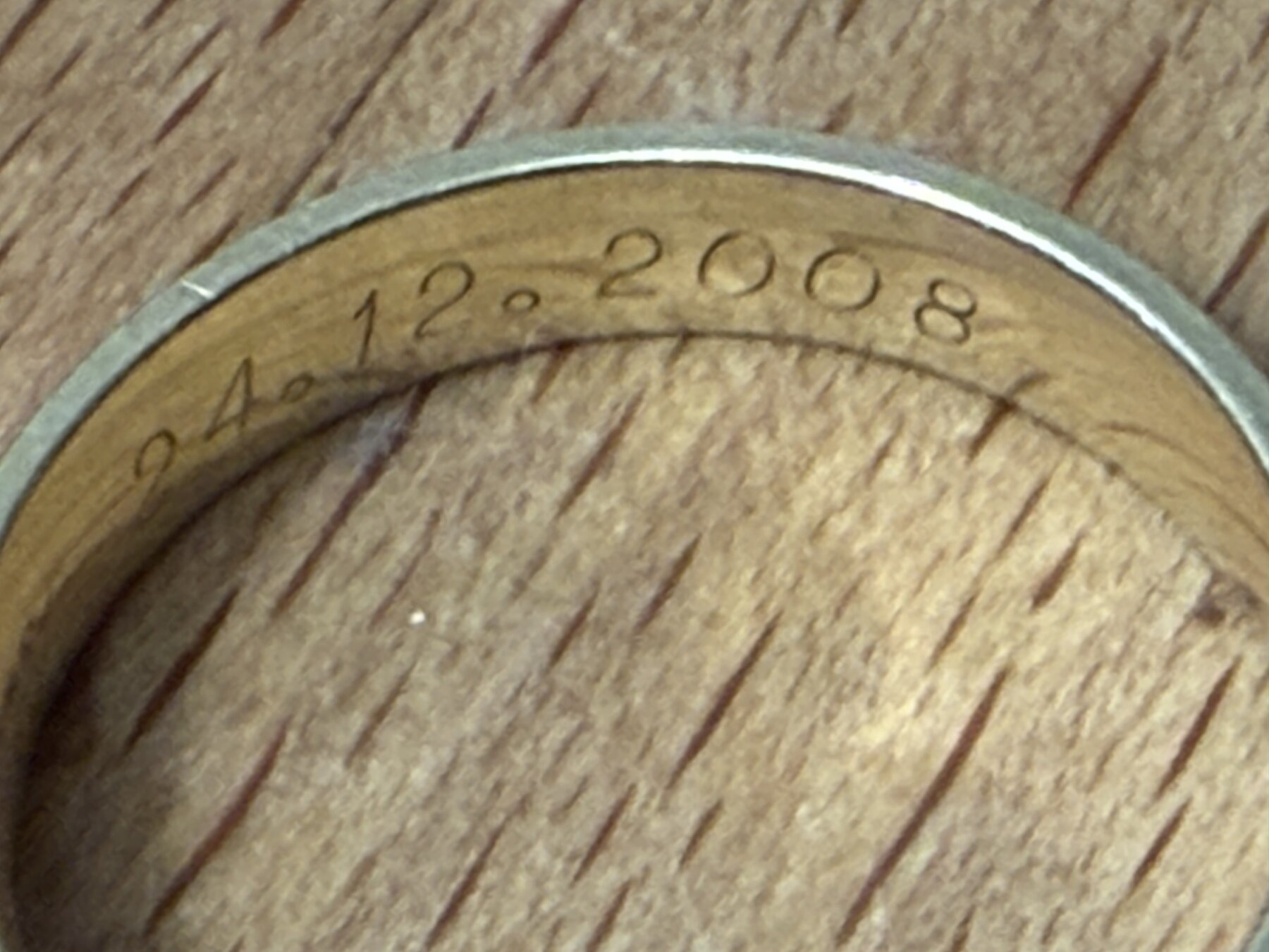 alt-text: makroaufnahme von der innenseits meines hochzeitsrings. dort steht 24.12.2008
