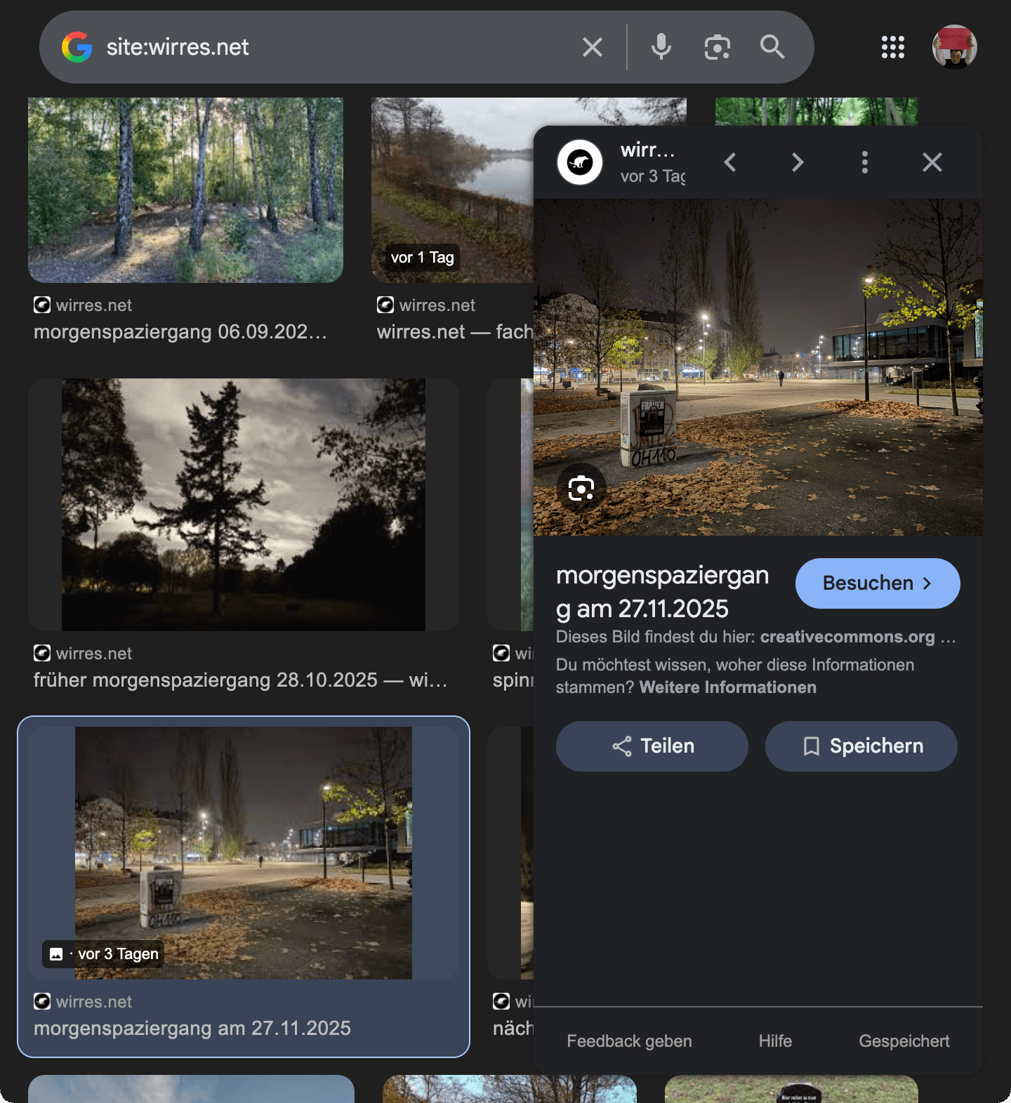 am meisten freue och mich aber darüber, dass nur 5 tage nachdem ich mir überlegt habe, meine fotos explizit und maschinenlesbar als cc-lizensiert zu markieren, google bereits eins meiner bilder aufgenommen hat, bzw. es mit dem cc-suchfilter anzeigt.