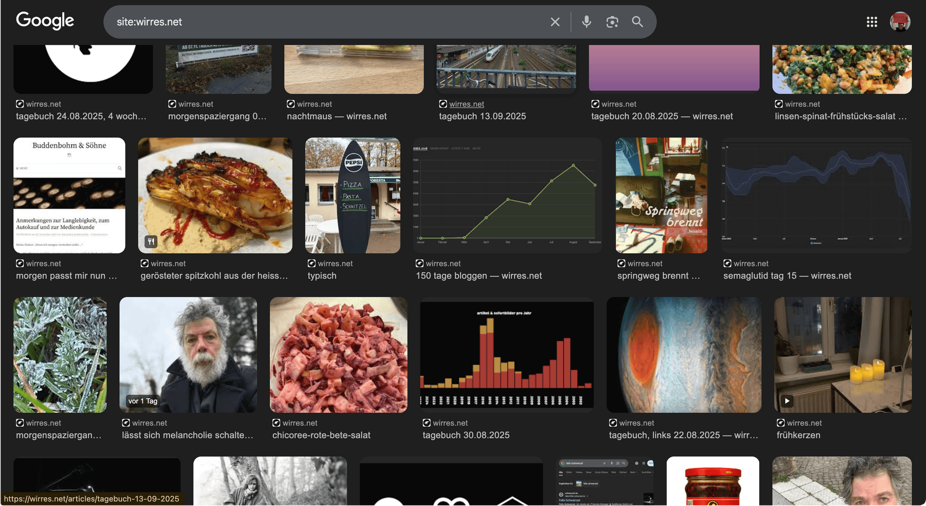suchmaschinenoptimierung im klassischen sinne ist mir ziemlich egal. was mir SEO-tools oder diverse LLMs vorschlagen, wie ich „bessere“, keyword-optimierte meta-descriptions, schlagwort-dichte oder überschriften formulieren könnte um bessere ergebnisse in den „SERPs“ zu erreichen, schlag eich in der regel in den wind. ich glaube ich optimiere meine texte, überschriften oder metadaten auch nicht besonders gut auf menschen. das liegt daran, dass ich noch nie eine zielgruppe vor augen hatte und eigentlich auch nix klickoptimieren möchte.