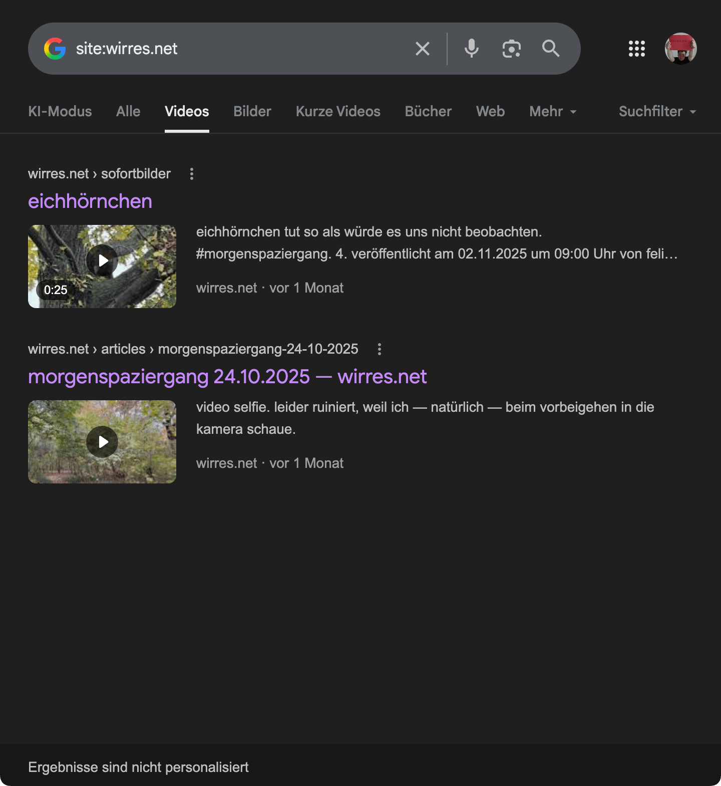 was ich auch hinbekommen wollte, aber eher als proof of concept: video-anzeige in google suchergebnissen. das scheint schwerer zu sein als gedacht, weil google die regel aufgestellt hat, dass videos, die teil eines artikels sind, nicht unter dem video-tab auf google suchergebnisseiten auftauchen. um dort aufzutauchen, muss das video der hauptakteur der seite sein, so wie bei youtube. da habe ich zwar theoretisch auch ein paar seiten anzubieten, aber google scheint da strenge regeln anzuwenden. selbst der spiegel scheint da nur drei videos untergebracht zu haben. ich habs auf zwei geschafft.