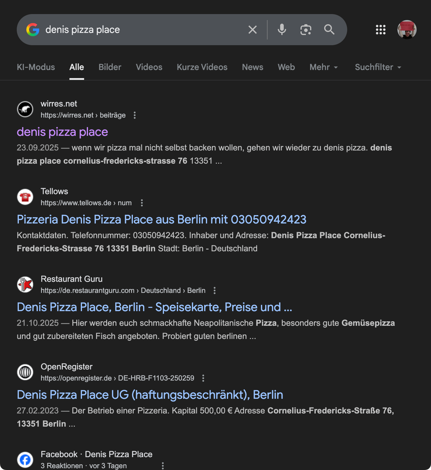 was noch nicht funktioniert: bewertungen von orten mit sternchen anzeigen. meine „rezension“ von denis pizza place ist zwar bereits auf seite zwei bis drei einer suche nach denis pizza place, aber ohne sternchen.