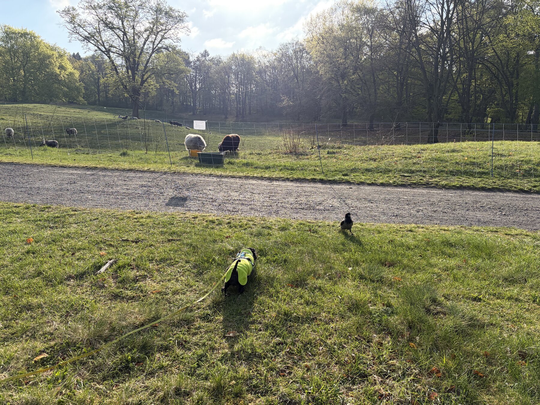 alt-text: foto von einem baum auf der bürgerwiese, davor stehen eingezäunte schafe, und eine krähe und frida