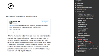 @nxD4n nö. ich importier nicht alle likes und reposts. ich like manuell über quill.p3k.io — wenn’s mir vertretbar erscheint. zumal ich, sowohl bei instagram, twitter als auch facebook, die offiziellen embed-codes unterstütze, auch wenn ich sie leicht modifiziere und bei instagram, twitter und facebook die benutzer entscheiden lasse, ob sie das javascript-geraffel der anbieter nutzen wollen. theoretisch sollte das jeweils von den TOS abgedeckt sein.