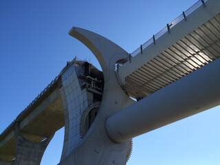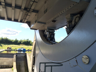 die konstruktion des schiffshebewerks ist ingeniös. die beiden gondeln, im prinzip gigantische badewannen mit komplizierten schliessmechanismen, wiegen dank des archimedischen prinzips stets gleichviel, so dass zum drehen des rads nur geringer kraftaufwand nötig ist. in der praxis ist das dann doch nicht ganz so einfach, wer mehr darüber erfahren will sollte es einfach, wie ich, in der wikipedia nachlesen.