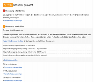 erstaunlich am ampproject ist, wie fehlerhaft es noch ist. die proprietäre video-erweiterung amp-video ist noch nicht ganz fertiggestellt, bzw. buggy, viele details scheinen noch unausgegoren und besonders witzig, googles eigenes beschleunigungswerkzeug empfiehlt dem ampproject verbesserungsmassnahmen: