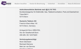 Nachdem ich von der zahl-einfach-mobil.de-Webseite, die von der Beratungsfirma GS1 Germany GmbH betrieben wird, zu der von O₂, der Telekom und Vodafone betriebenen Webseite mpass.de geleitet wurde, sehe ich zunächst, dass mpass.de — trotz des Apple-Weckrufs — sehr stiefmütterlich gepflegt wird. Im Impressum der Webseite ist noch René Obermann als Vertretungsberechtigter der Telekom aufgeführt, obwohl der bereits vor knapp andertalb Jahren seinen Posten bei der Telekom verlassen hat.