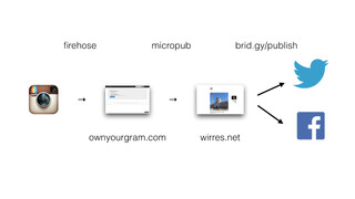 im detail funktioniert das so: instagram pingt nach der veröffentlichung ownyourgram an, ownyourgram veröffentlicht per micropub-schnitstelle das bild auf meinem blog und mein blog pingt bridgy an das bild auch auf twitter und facebook zu posten.