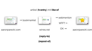 mit einem quill-bookmarklet habe ich per klick einen artikel auf wirres.net erstellt der per microformat-auszeichnung (like-of) die information enthält: felix schwenzel mag einen artkel mit der url https://aaronparecki.com/articles/2015/04/26/1/html-is-my-api. sende ich jetzt einen webmention von wirres.net zu aaronpareki.com guckt aaronpareki.com was der schwenzel da gemacht hat — aha — ein like, und vermerkt das unter dem artikel.