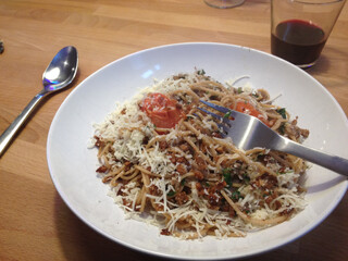 jetzt die fein geschnittene petersilie noch kurz mitanbraten, dann werden auch die eventuell mitgeschnittenen dickeren stängel geniessbar. am ende kommen die spagetti dazu, allerdings nicht die ganze packung, nur zwei kleine portionen. ich habe an dieser stelle noch zwei tassen von dem gut gesalzenem spagettiwasser in die pfanne gekippt und alles kräftig gemischt. die tomaten können jetzt auch dazu.