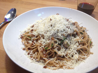fast fertig: zum servieren die nudeln auf einen teller, die brotwürfelchen drüberstreuen und den teller parmesanieren.