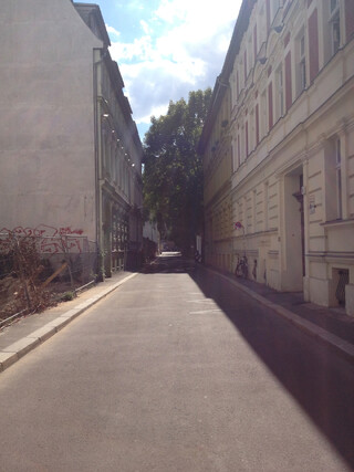 zwischendurch bricht der beton auf und es tun sich strasse auf die aussehen als seien sie aus düsseldorf hierher gebeamt worden. düsseldorfer chique trifft berliner grössen- und 70er-jahre effizienzwahn. ich musste dann irgendwann ein bisschen in die wohnviertel nach westen abdriften, weil mich die bundesallee zu sehr frustrierte. dort gibt es offenbar eine hackerstrasse.