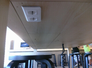 die tische sind etwas komplizierter konstruiert. die tischbeine scheinen massiv zu sein, die tischplatte ebenso, aber sie hat ein innenleben (fotos vom innenleben). unter den tischen sind revisionsöffnungen um den kabelsalat unterzubringen, der in der tischmitte nach unten in den boden geführt wird. diese art der kabelführung spricht auch dafür, dass die tischbeine massiv, aus vollholz gefertigt sind. wären sie das nicht, hätte man sie dafür nutzen können die kabel nach unten zu führen.