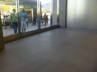 ich bin kein grosser freund von glas als raumelement oder einrichtungsbaustoff. glas ist immer irgendwie dünn, wirkt zerbrechlich und wenn man es genau betrachtet wirkt es gar nicht transparent, sondern massiv, weil es halt spiegelt. die treppen in apple stores sind (fast?) immer aus glas gebaut, was ich bis jetzt immer eher albern fand. als ich so eine treppe jetzt erstmals in echt sah, musste ich mein urteil revidieren. so wie apple das glas verwendet, zusammengeklebt aus mehreren scheiben zu einem ungefähr fünf zentimeter dicken ding wirkt das glas plötzlich wie durchsichtiger stahl. stark, kalt, glatt, glänzend — und hart sowieso. auch die details, wie die edelstahl-geländer befestigt sind und wie die glaswangen der treppe im boden verschwinden kann man besser nicht lösen. auch klug, die treppenstufen sind zwar auch aus glas, aber undurchsichtig gesandstrahlt und mit pickeln versehen die sie rutschfest machen.