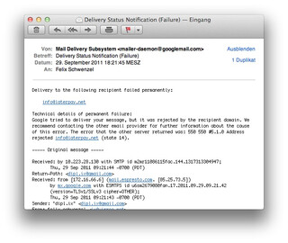 am 29.09.2011 schronb ix eine email an laterpay, um nachzufragen was denn an kosten auf benutzer zukomme, wenn sie mehr als €5 im warenkorb haben und welche persönlichen daten dann angegeben werden müssten, die mail kam aber als unzustellbar zurück. wohlgemerkt: ich habe die email an die auf der website angegebene emailadresse geschrieben.