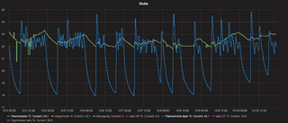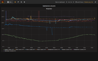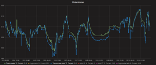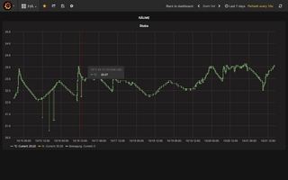 in grafana erkennt man dann, dass die sensoren einerseits immer wieder (kurz) falsche werte funken, aber auch, dass die temperaturen in unseren räumen bemerkenswert stabil sind und meist nur zwischen einem bis andertalb grad fluktuieren. wir haben das glück, dass unsere wohnung einerseits gut isoliert ist und andererseits kaum fenster und aussenflächen hat. lediglich das kinderzimmer hat eine wand und ein paar fenster zur strasse, küche, stube und schlafzimmer haben je ein fenster und sehr wenig aussenwandfläche, die zudem auch noch gut isoliert ist. auch die fenster sind (relativ) neu und halten offenbar die kälte (oder hitze) gut draussen.