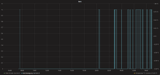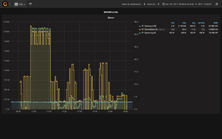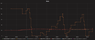 gleichzeitig grossartig und erschreckend finde ich das vergnügen, dass ich an den gesammelten daten habe. oben sind die daten des temperatur- und feuchtigkeitssensor im bad zu sehen, sowie die laufzeiten des ventilators. man erkennt gut, wann einzelne einwohner der wohnung geduscht haben, und wenn man genau hinsieht (reinzoomt), auch unsere stuhlgangzeiten (wenn wir danach höflicherweise den ventilator eingeschaltet haben). die bewegungsmelderdaten zeigen relativ zuverlässig an, wann jemand spät nach hause geht oder der letzte das haus verlässt. der luftfeuchtesensor ist (zumindest an der stelle an der er momentan angebracht ist) so empfindlich, dass man ihn beinahe als präsenzsensor nutzen kann, dafür muss man ihn natürlich nicht anhauchen, sondern es reicht einfach im bad zu atmen.